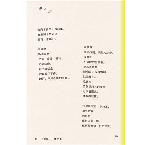 自由體,「體」不是指體裁和文體,體是宇宙的星體。想像四十六億年前,太陽系和地球由無數「微粒子」凝聚而產生,其後,地球又經由無數的「微行星」撞擊、聚合,終至成型。無數的微行星撞擊──是促使地球誕生的源起,這三部作品中的每一則都是「微行星」,它們相互碰撞,有的聚合,有的再生,有的殞落,生命於焉肇始,這是三部曲創作的初心,原型的發生。