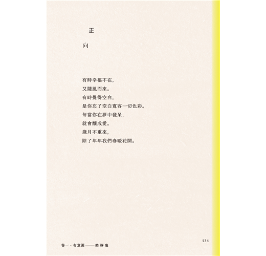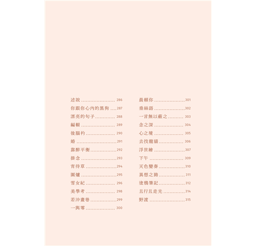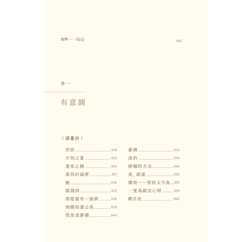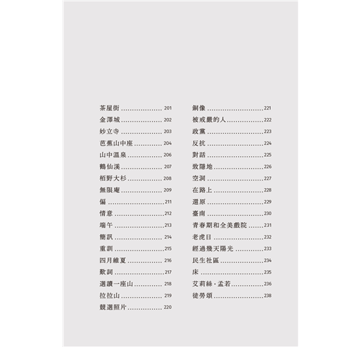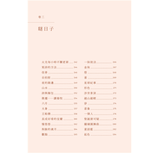 火光每小時不斷更新/寫詩的方法/改善/自拍照/夜的路邊/山水/詩與麵包/微塵──讀楊牧/六月/大暑/王船醮/長成好看的宜蘭/慢悠悠/狗臉的歲月/觀點/一抹說法/金秋/想/喜/星球紀事/形色/涉世景深/越山越輕/穿/意象/一個人/聖誕節可疑/鐵鏽圓舞曲/童話藍/起色/述說/你跟你心內的黑狗/漂亮的句子/編輯/後腦杓/婚/靠醉平衡/掛念/宵待草/圍爐/雪女紀/美學考/若沖畫卷/一與零/晨賴你/垂絲語/一言無以蔽之/念之深/心之境/去找龍貓/浮世繪/下午/天色變奏/異想之路/塗鴉筆記/且行且走光/野渡