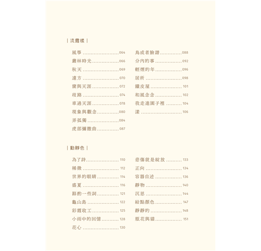 為了詩/稀微/世界的眼睛/盛夏/斟酌一些詞/龜山島/彩霞收工/小雨中的回憶/花心/悲傷就是綻放/正向/容器自述/靜物/沉思/給點顏色/靜靜的/瓶花與貓