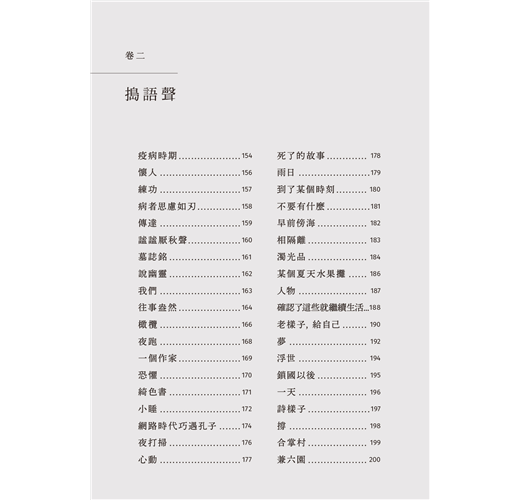 疫病時期/懷人/練功/病者思慮如刃/傳達/謐謐厭秋聲/墓誌銘/說幽靈/我們/往事盎然/橄欖/夜跑/一個作家/恐懼/綺色書/小睡/網路時代巧遇孔子/夜打掃/心動/死了的故事/雨日/到了某個時刻/不要有什麼/早前傍海/相隔離/濁光品/某個夏天水果攤/人物/確認了這些就繼續生活/老樣子,給自己/夢/浮世/鎖國以後/一天/詩樣子/撐/合掌村/兼六園/茶屋街/金澤城/妙立寺/芭蕉山中座/山中溫泉/鶴仙溪/栢野大杉/無限庵/偏/情意/端午/簡訊/重訓/四月維夏/歎詞/選讀一座山/拉拉山/競選照片/銅像/被戒嚴的人/政黨/反抗/對話/致隱地/空洞/在路上/還原/臺南/青春期和全美戲院/老虎日/經過幾天陽光/民生社區/床/艾莉絲.孟若/徒勞頌