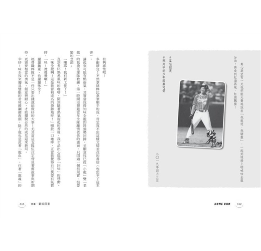 或許,可能讓你覺得不太過癮的是在興農牛、統一獅待得不太開心的泰山,回述這些過往時,採用點到為止的方式輕輕帶過,讓想聽一些八卦、祕密的人可能失望了;不僅如此,在第二章的最後,泰山還以文情並茂的方式,寫了封信給在天上的興農創辦人楊天發先生,信中先親切地叫了聲:「阿公!」問候他老人家在天上好嗎?然後泰山報告了他的近況,且說了些來不及和楊老分享的小祕密,這段有讓我感動到,泰山用這樣方式記憶他的牛隊時代,也正可顯示他的厚道之處吧!