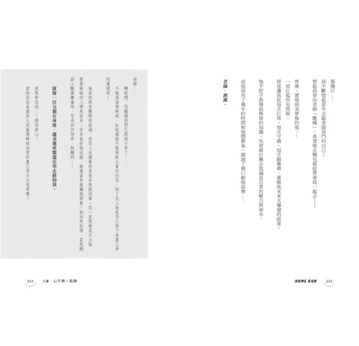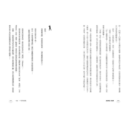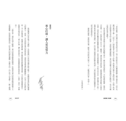 按本書寫法,泰山的棒球生涯從臺北起,轉到臺中、臺南,然後飛到日本、澳州,最後像跑回本壘般地繞回臺北,他這段人生全壘打之旅多數時間我在旁邊看著,臺灣職棒每個世代選手認識不少,泰山算是當中有話聊、有交情的。書中有些故事曾聽他親口說過,如他兩度要加入當年被我們視為「匪區」的臺灣大聯盟,幾乎都要簽下名字那刻,卻陸續因徐總及戰友葉君璋的一通電話令他打消念頭。當時聽到此事的我心想,這也太像電影情節、太戲劇性了吧!如果當時沒有這些來電或晚點到,甚至處在沒有手機的年代,那之後,是不是泰山的職棒生涯很難OEO了呢?