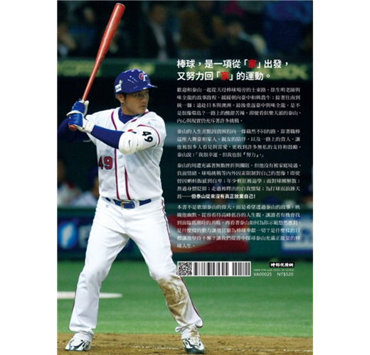 本書不是歌頌泰山的偉大,而是希望透過泰山的故事,映襯他幽默、從容看待高峰低谷的人生觀。讓讀者有機會找到面臨低潮時的共鳴,再看著他如何為你示範悠然應對困頓。是什麼樣的動力讓他甘願為棒球奉獻一切?是什麼樣的目標讓他堅持不懈?讓我們從書中探尋泰山充滿正能量的棒球人生。