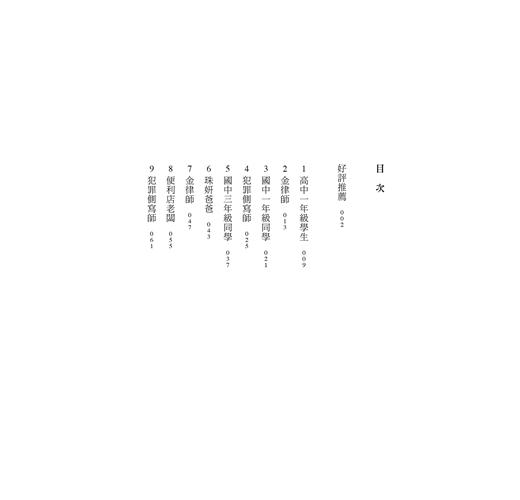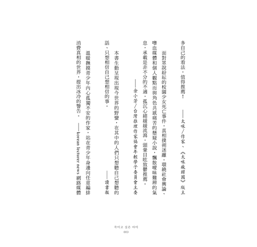 ※面對眾說紛紜的校園少女死亡事件,真相撲朔迷離。環繞社會輿論、嗜血媒體和個人觀點而與角色共感痛苦的懸疑小說,飄散曖昧難辨的氣息,承載是非不分的不適,孤沉心緒緩緩流瀉,頭暈目眩致鬱推薦。──余小芳\台灣推理作家協會年輕學子委員會主委