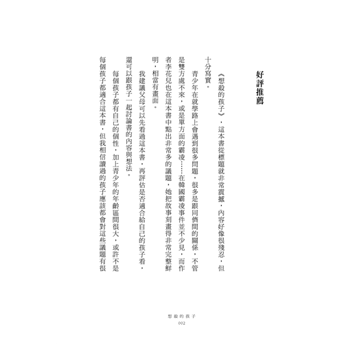 每個孩子都有自己的個性,加上青少年的年齡區間很大,或許不是每個孩子都適合這本書,但我相信讀過的孩子應該都會對這些議題有很多自己的看法,值得推薦!──太咪\作家、《太咪瘋韓國》版主