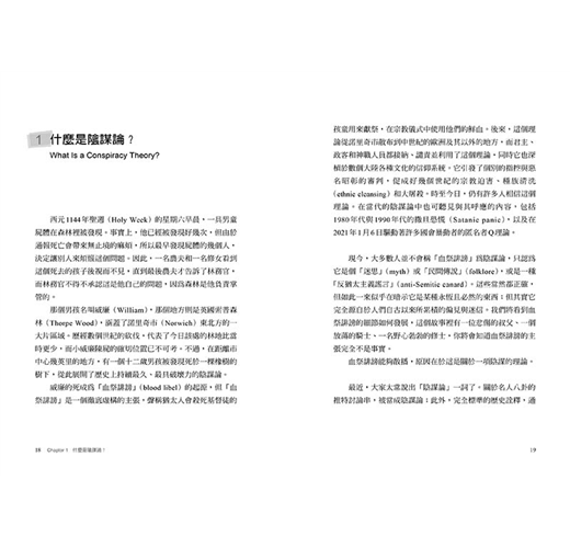所以,如果想了解陰謀論在社會中所扮演的角色──它們如何影響我們的政治、文化,以及如何將我們所愛之人拉進妄想的兔子洞──我們就得先了解其歷史。我們必須知道陰謀論源自何處,為什麼人們會相信,為什麼它們在某些環境中就是比較容易出現,以及我們的腦袋為何為傾向於相信它們。