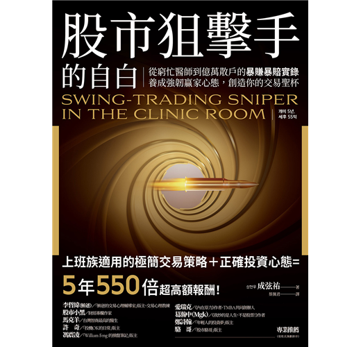 ★「不要怪任何人,敵人就在自己心裡」是書中標題,也是我認為貫串全書的精華所在。如何當個好的股市狙擊手?絕大多數時間都在等待,等待好的行情到來!你需要健全的「心理素質」,讓你靜心等待,鎖定良機,應對無止盡的低潮。作者的致富關鍵,在於他讓人生與投資的步調保持一致,用最舒服的心理狀態做交易,才能做得好、做得久!──李哲緯(鮪爸)/「鮪爸的交易心理輔導室」版主、交易心理教練
