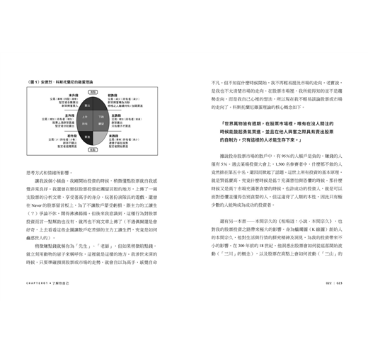 大學畢業後我不曾開過證券帳戶,也沒有像其他人一樣認真研究理財,但既已下定決心,我便前去開戶。匯入1,000萬韓元(時約26萬新臺幣)的本金後,急忙去了趟書店,拿起兩本最吸睛的股票投資書籍,回到家後便開始閱讀。我當時沒想要成為大富豪,也沒想過要成為股票投資的高手,滿腦子只想著,「如果在勞動所得上加上股票投資的收益,明天會過得比今天更好嗎?」「我能在沒有父母的幫助之下,稍微快點達成全國一家之主們的願望,在首爾買一套房嗎?」