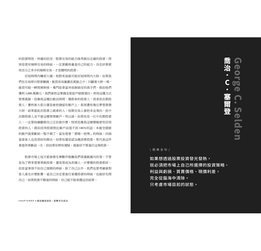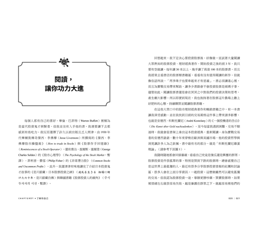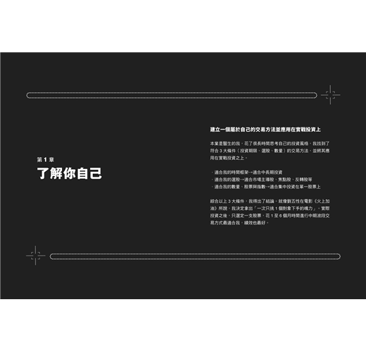 ★作者將自己的操作實戰經歷分享給大家,從如何了解自己到找出自己的投資策略,將人生的轉變融入其中,找出屬於自己的投資旅程。我想每個人都有屬於自己的投資旅程,或許過程不像作者那麼精采,但他的學習態度與方法是值得大家去學習的,誠心推薦給大家~──駱哥/「股市駱哥」版主