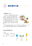 本書大致分成「韓文基本介紹」、「10課教學章節」、「24個重要表現」。「韓文基本介紹」是讓學習者在正式熟悉韓文字母前,盡可能解釋,讓學習者了解韓語跟中文截然不同的特徵。「10課教學章節」每課皆以〈5分鐘暖身!〉、〈開始來學吧!〉、〈韓語輕鬆說!〉、〈韓文寫寫看!〉、〈趣味小測驗!〉五個學習階段構成,每階段均提供多樣化的練習題與聽力資料,學習者光依照本書架構學習,就能有系統、趣味盎然地學習韓語。「24個重要表現」是將韓國生活中必學的24個表現,搭配情境圖製成小卡片,讓學習者可以隨身攜帶,在適當的情境中立即使用。