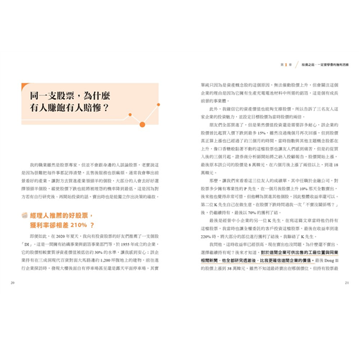 如果要舉出本書與其他大多數的股票投資書籍不同切入點的話,就是我努力想要在理論上探討投資基礎要素組成的同時,也在實證上去支持這些觀點,並且強調不只是現在正在發生的現象,十年後再把這本書拿出來看也能適用,如同投資基本原則的這種基礎內容。