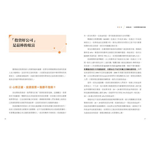接著覺得應該分享更廣泛的投資心法,給日以漸增的散戶投資人、夢想成為基金經理人的學生等等,那些對股票投資有興趣與熱情的人,讓投資人能夠達到「不會虧損的投資」,才是更加有意義的。最終從有效的投資理論與企業分析方法開始,到對實戰有幫助的投資人心態調整、危機處理方法⋯⋯等,都全面涵蓋其中。