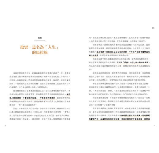 投資就像名為人生的馬拉松,好像已經跑了很遠的一段路,但之後路程的不確定性仍讓人期待萬分;即便如此,我覺得好的經驗越多,就越能用享受的心態繼續這個旅程。希望讀者盡可能地將我二十年以上的心法與精華,以一頓晚餐的價格好好地全都吸收進去。