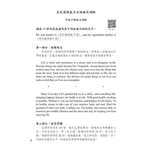 ◆附口說測驗「考場真實模擬」與「解答範例」QR碼線上音檔。可用手機掃描QR碼練習口說測驗題目。