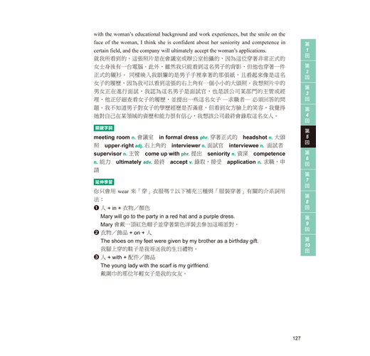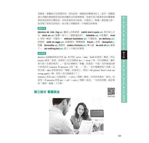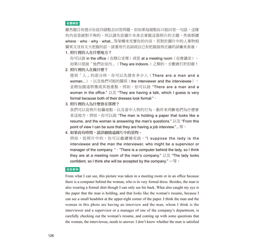 第三部分「看圖敘述」的部分,讓考生在看到圖片時,可以從圖片的細節找到線索,並將這些線索彙整成符合邏輯的敘述,以及如何取得高分的 SOP,給予考生這張照片需要講到的重點是什麼,並逐步地建構出完整且流暢的論述。另外也提供您在答題時可以派上用場的句型,讓論述更通順。
