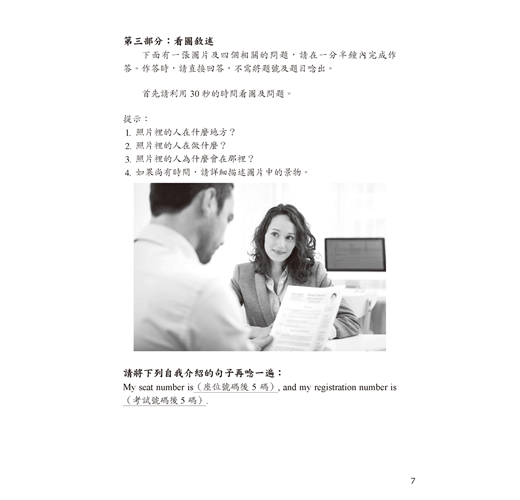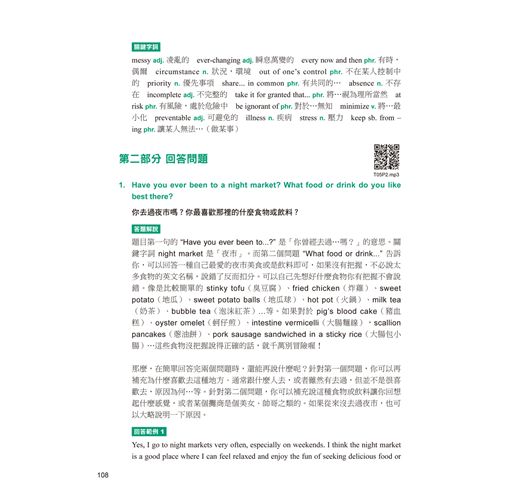 第二部分「回答問題」的「答題解說」,提供考生應對各種試題情境的應對策略,並且幫助考生在考試時有效地找出最符合邏輯的回答,並達到考官給予高分的標準。