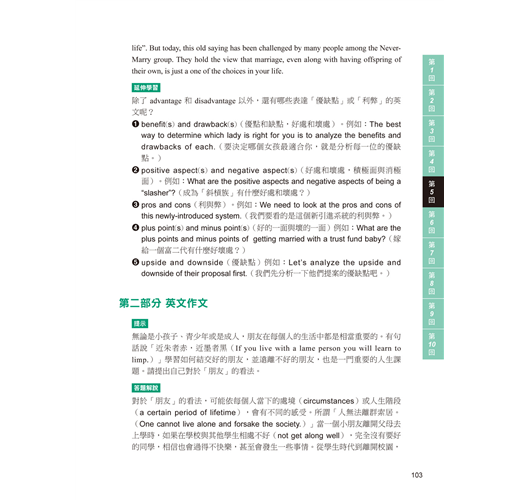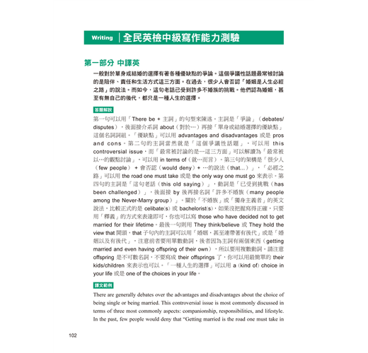 英文作文的「答題解說」讓考生對於這篇作文考題,能夠學習「草擬架構」,並準備好關鍵字詞及「適用句型」來下筆。接下來再提示能夠表達自己想法的「寫作方向」。作文範例除了提供中文翻譯之外,也有如上述延伸學習的單元,讓考生在準備英檢考試的同時,能夠學習到別的教材裡沒有的、甚至是學校不會教的語文知識,或更母語人士更道地的用語。