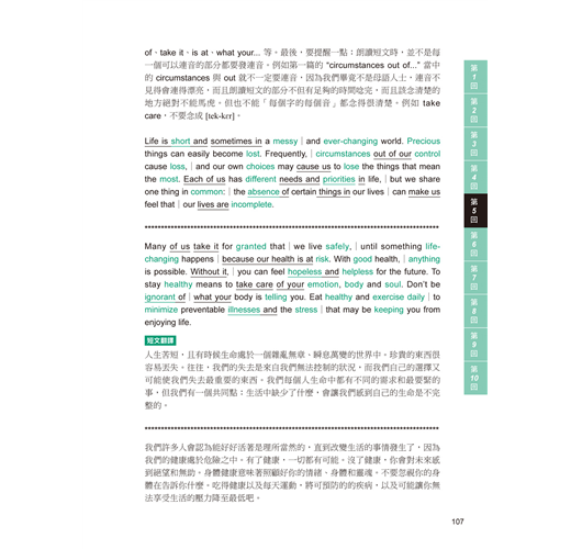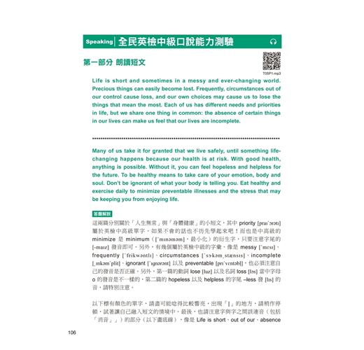 中級「口說能力」應考攻略,何時答題,答題時間多長,都依指示操作第一部分「朗讀短文」解析的「答題解說」,除了提供關鍵單字的發音,也幫您找出朗讀時要注意的發音技巧,包括標出需要發「重音」的單字、必須「連音」、「消音」的部份,以及「斷句停頓」的位置。