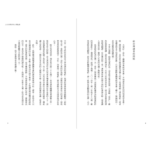 二○二○年九月十日。在澀谷一棟透露出年代久遠的大樓一室中,我和責編S小姐第二次針對新書討論。S小姐每次都會送我很棒的伴手禮。上次是精緻的巧克力,這次是完熟麝香葡萄。我們就在大快朵頤美味葡萄之際,順利討論進度。兩人全神貫注之下,一回過神發現竟然已經談了兩個小時。提出了比當初設想得還豐富的點子,迅速定下了本書的方向,我想接下來就能捲起衣袖開始動筆。 「想不想試試寫點短篇隨筆?」當初對方提出邀約時,我在高興之餘更感到憂心,雙手還稍微顫抖。雖然我平常喜歡寫點東西,但從不認為自己有能力書寫一本書。「妳只要忠實記下自己最原始的心情就行啦!」在編輯這句話的鼓勵下,我終於下定決心,踏入那個未知卻嚮往已久的領域。 第一次碰面討論時,我們倆帶了很多各自喜歡的書。十幾本在長桌子上一字排開的書籍,每一本都能讓人感受到紙張的溫暖,實在太美好,看著看著忍不住就露出微笑。「我可以看看嗎?」我拿起其中一本書,拆掉包在外層的書衣,用指尖觸摸著外露的封面。S小姐看著我笑道,「妳真的很愛書耶!」接著她又說:「會喜歡書本裝幀到這種程度的,就是真正的愛書人。」是的,我真的好愛書。在談論「閱讀」這項行為之前,我對「書本」這項物品就有道不盡的喜愛。我下定決心,「要盡情灌注這股熱愛!」 我接受編輯的建議,再一次正視自我,並且嘗試忠實記錄下來。無論粗劣也好、笨拙也罷,我仍試著以「愛書」這股最原始的心情採取直球對決、正面突破。不確定是否能突破那道障礙,希望一切順利。 希望各位能秉持輕鬆但盡可能溫暖寬容的心態,享受這本作品。