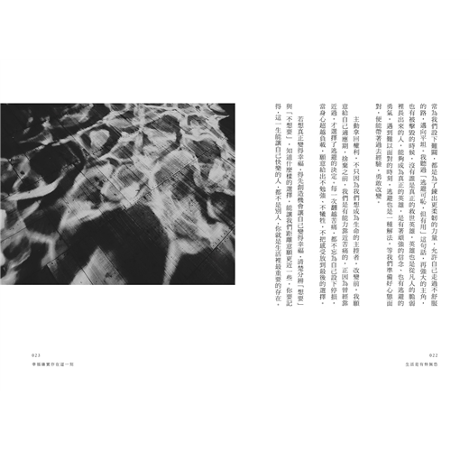 人生,是度日子還是過生活,其實是有差別的。藉由作者細膩的觀察與經歷,我們彷彿也可以透過不同視角重新體驗――原來,生活也能這樣詮釋;原來,我也能是別人幸福的存在;原來,光是好好活著就已經不容易;原來,我也能把生活活成燦爛的篇章。