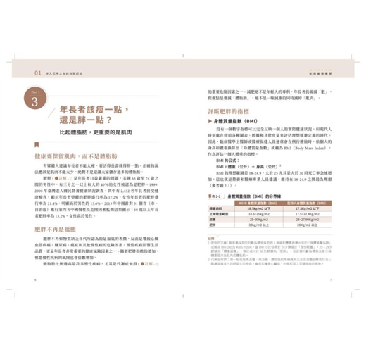 第三章介紹年長者常見疾病認識與保養,詳細解釋各類疾病,包括心血管疾病、糖尿病、癌症、骨質疏鬆、免疫、口腔、視力、便祕等等的營養相關問題。