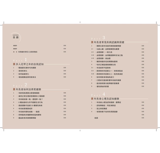 本書分為四章,第一章介紹「老化」的課題,所謂嬰兒潮1946~1964年出生的世代,面對年老的挑戰,必須控制慢性病,不斷學習延緩衰老,積極面對老化。