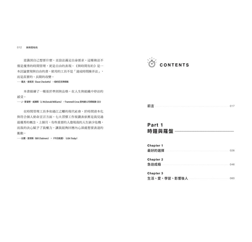 「人的一生,透過不同角色組合而成。不管是在職場還是生活中,書中用羅盤與時鐘的比喻,提醒大家「丟掉時鐘,拿起羅盤」。我們不該受制於時鐘所規範的速度與效率,而應以成效為焦點,用心中的羅盤指引方向,做出重要的選擇與排定。將時間轉換成優先順序,再以專注為原則核心,就能做時間的主人,持續地往想要的目標邁進,達到期望的人生願景。」
