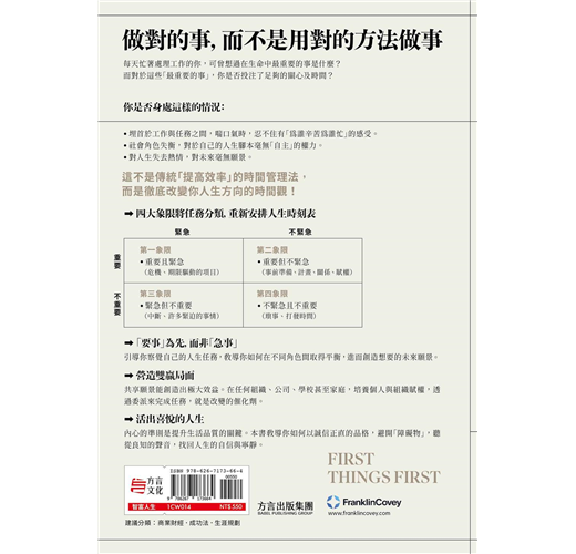 工作堆積如山,你以為更快速地解決問題是唯一解方,但事情只會更多卻不會減少。邀請你先檢視使用時間的方式,你是否只在處理「急迫」的任務,而非「真正重要」的人生使命?本書帶你回到內心的準則以校準人生,創造良好的生活品質。