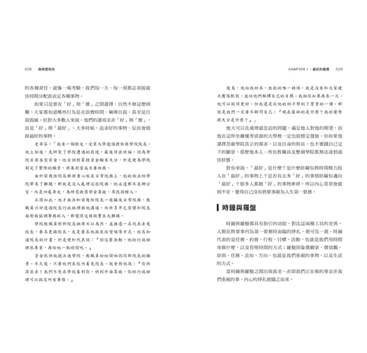 傳統的時間管理建議,你要做的是提升執行效率,進而才能支配自己的人生,獲得內心的寧靜與成就感。本書的內容顛覆時間管理的概念,將重點放在以普世準則為核心的生活態度,而不是給你更多的傳統處方箋,要求你做得更快、更努力、更聰明。因為比起把事情迅速做完,你選擇做什麼,以及為何你選擇這樣做,其實更重要。