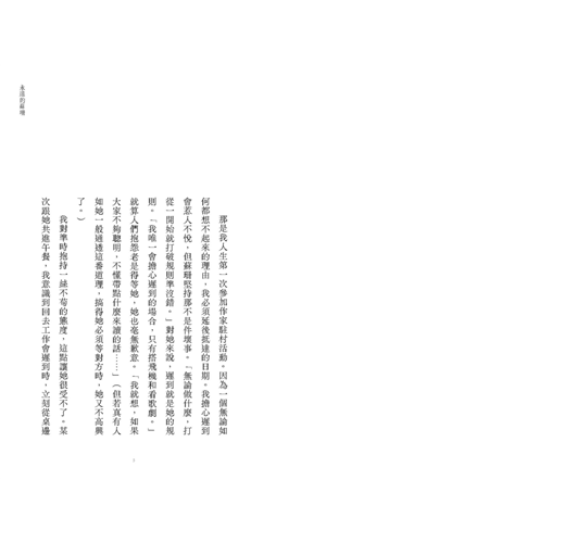 .某次跟她共進午餐,我意識到回去工作會遲到時,立刻從桌邊跳了起來,她態度訕笑,「坐下!妳不需要那麼準時。別活得那麼卑微。」卑微是她最喜歡講的詞彙之一。
