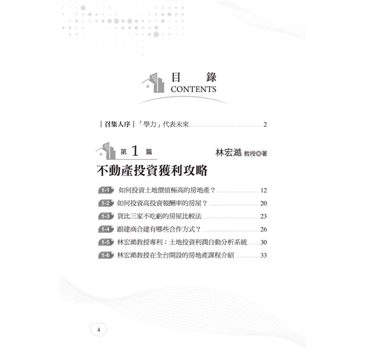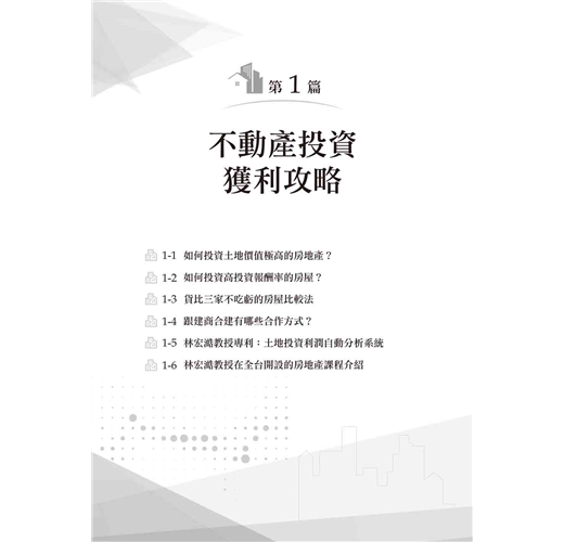 從如何找到高投資報酬率的物件、購買違建有什麼風險、為什麼房價只會一直漲、建商眼中最好的投資標的是什麼,到該如何行銷中古屋等9大主題,就讓業內最資深的專家全方位帶你深入解剖房地產領域,實務與理論並進,不論自住還是投資者必讀!
