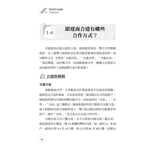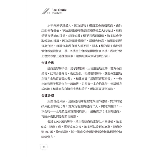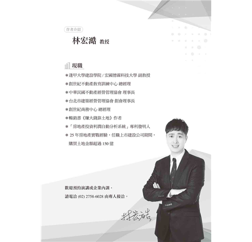 希望藉由本書幫助一般投資大眾及建築業、房仲業、地政士等不動產相關同業,建立更專業與實務的房地產知識,也非常歡迎讀者,加入我們學習交流及成長的平台――「中華民國不動產經營管理協會」和「台北市建築經營管理協會」,我們協會活動上見!期待與您相遇!