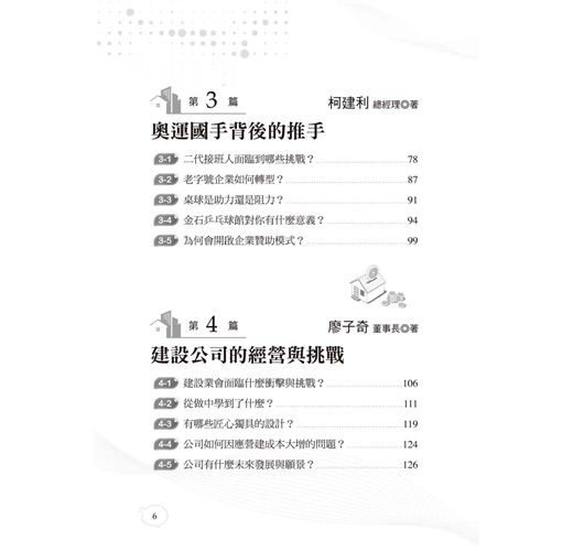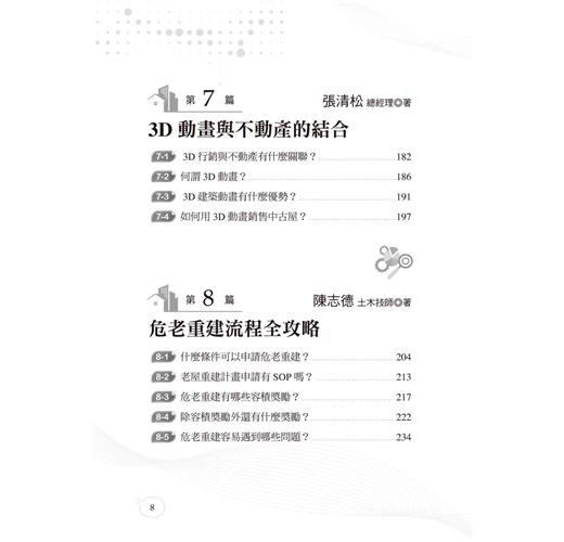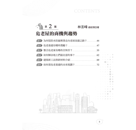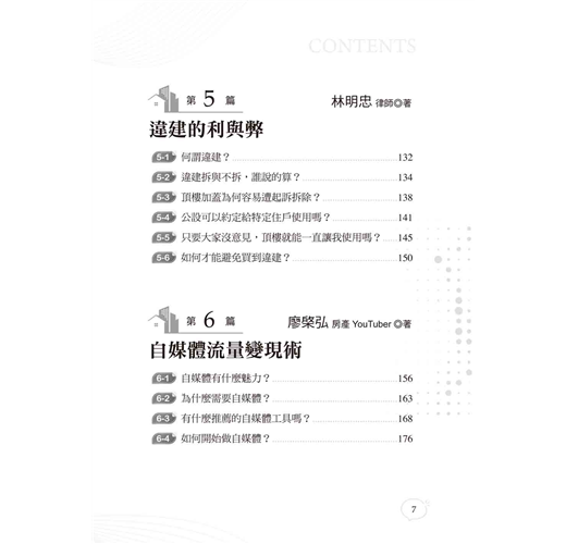 本書召集了協會重要幹部,從許多面向探討房地產的專業,從「不動產投資獲利攻略」、「危老屋的商機與趨勢」、「危老重建流程全攻略」、「奧運國手背後的推手」、「建設公司的經營與挑戰」,到討論法律面的「違建的利與弊」,行銷面的「自媒體流量變現術」、「3D動畫與不動產的結合」,產品規劃面的「橫跨三代的共居藍圖」等房地產重要議題,皆有深入的探討與分享。