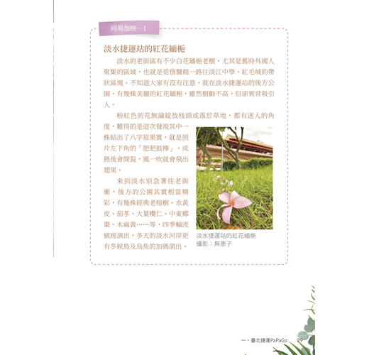 每一路線的後面有「同場加映」,提醒所有的讀者,千萬別跳過。現在看完電影,觀賞者都不會急著走出電影院,渴望片尾能播出的〈幕後花絮〉,有時看導演拍片的專注、有時是演員拍片NG的糗樣、或對演時醞釀情感的尷尬、或因劇情受傷忍痛完成動作……,很真實的畫面,雖不是主劇情,卻緊緊繫住觀看者的情感。而「同場加映」就有這樣的效果,不單看見無患子拍攝的功力,也見作者對一花一草的情感,一景一物的認真與細膩。