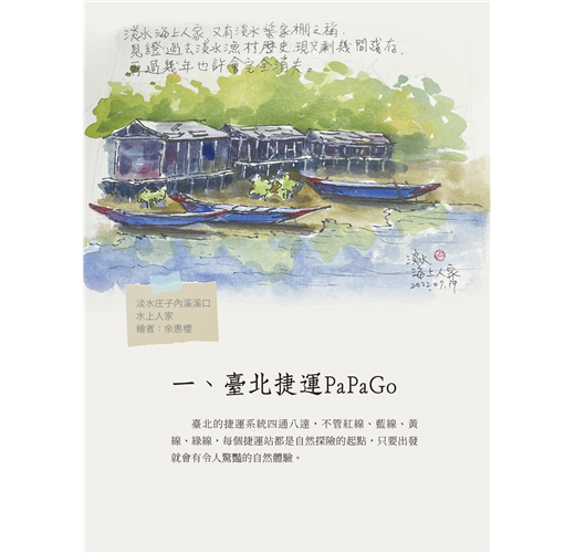 本書分別依照捷運可到、公車可到、雙北郊山、東北海岸、水圳步道、水漾溼地等章節,整理出48個用大眾運輸工具就可到達的輕旅地點,現在就讓我們打開五感,從眼觀、耳聽、鼻聞、皮膚觸感、適時品嘗等形式去認識、體驗自然。