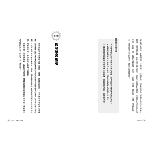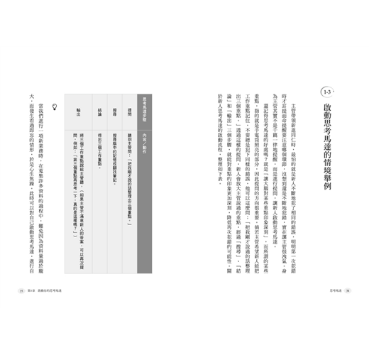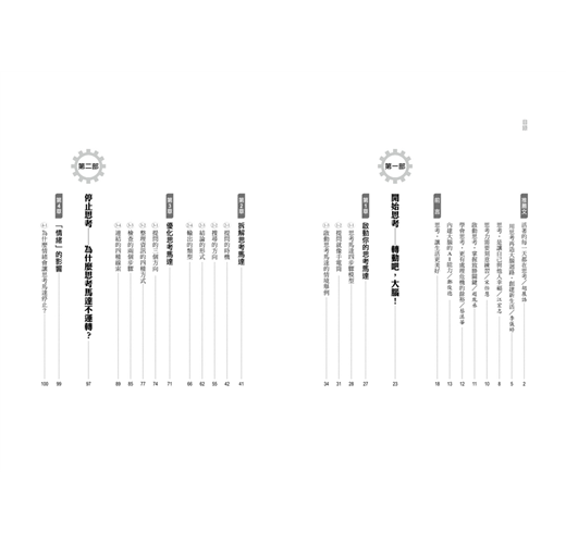 本書分成三部,第一部分享啟動思考馬達的方法,讓你無論在生活或工作中都能輕鬆運用。第二部將探討生活中無法啟動思考馬達的原因,帶你有效移除這些原因,順利轉動你的思考馬達。第三部的關鍵在於運用,在掌握啟動思考馬達的方法後,帶你試著運用到生活和工作中,看見思考融入生活的各種可能性以及創造出的美麗風景;此外,把焦點從個人轉移到生活和工作中的重要他人,透過引導對方啟動思考馬達,一起做出重要決定。最後的附錄整理了本書出現的重點、表格和參考書籍,讓你讀起來更輕鬆。