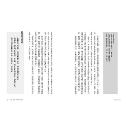 翻開這本書,就像是聘請一位鍛鍊思考的教練隨身在側,他會告訴你許多啟動思考馬達的策略,幫助你用一套嶄新的觀點來看待事情,但同時你也必須在生活中實際去練習。