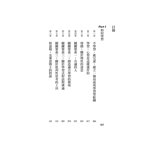 ◆ 作者將本書設計成一部學習的藍圖,可以使每個個人、組織或團隊,無分大小,無論行業或部門,都可以成為一個更好的學習者與學習型組織,並從中受益。