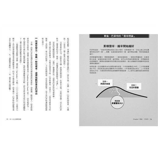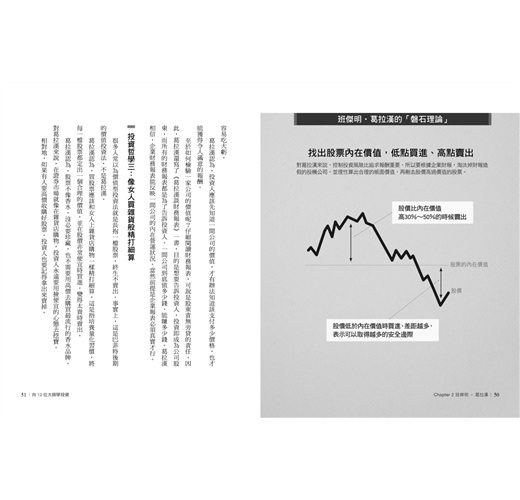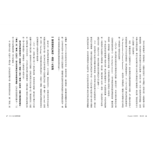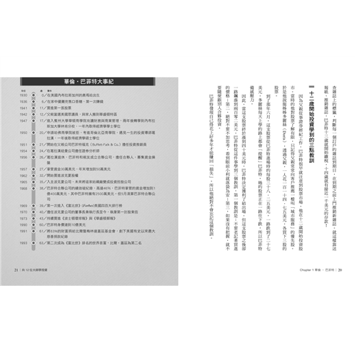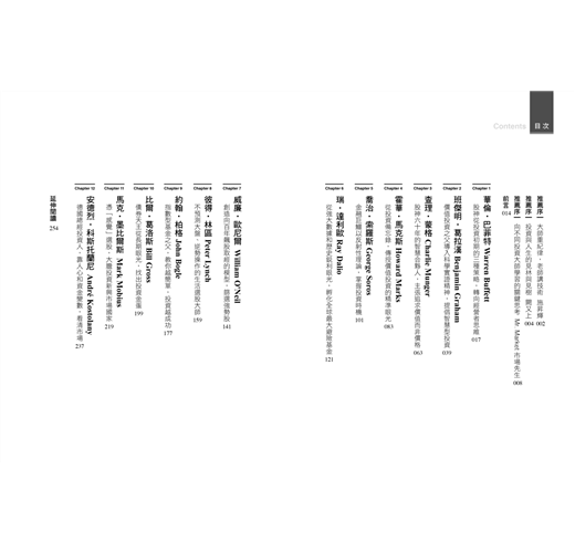 這是一本最適合當今大多數人閱讀習性的書。只要看完這一本,就不必再去讀這十二位大師各自寫的書,因為體貼的編輯已經幫大家整理出他們畢生的投資精華,讓你不只用最少的時間,更只要花最少的錢,就能一窺大師們最重要的核心理念和最寶貴的投資經驗,CP值高到破表。