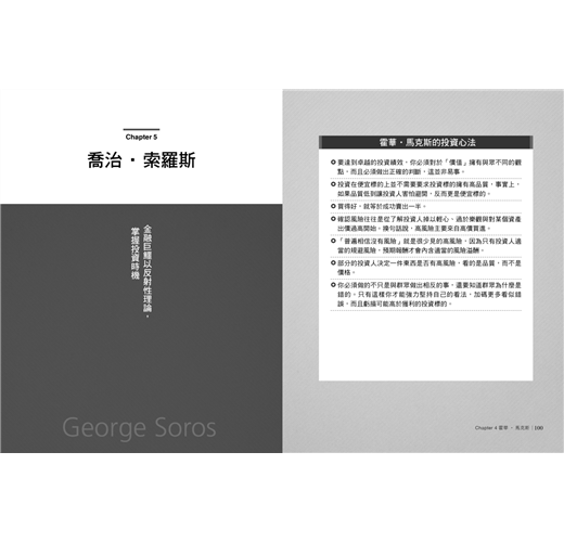 這本書精選《商業周刊》歷年來的投資大師介紹,並進行編輯、改寫,詳述各類型的投資大師怎麼踏入投資世界,並歸納、整理大師的投資智慧。每位讀者都能從中輕鬆掌握大師的成功精髓,挑選適合自己的方法學習。