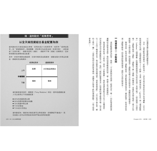 另一位知名大師則是橋水基金創辦人瑞‧達利歐(Ray Dalio)。達利歐多年來蒐集各類市場的數據,並輸入電腦建立模型,找出減少風險並增加報酬的投資策略,這套策略也帶領橋水基金公司多年來蟬聯全世界最大避險基金公司的地位。