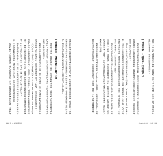 「本書的精彩之處,重點不在談投資技巧之『術』,而是投資『心法和觀念』。投資有股海之稱,派別之多自是令人眼花撩亂;投資者的學習,若一開始就能一睹見林的全貌,再依自己的能力和喜好,鑽研所中意的學派,這時再一窺堂奧,更有其效益。」