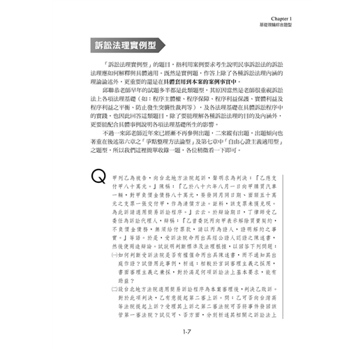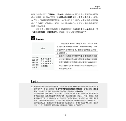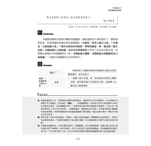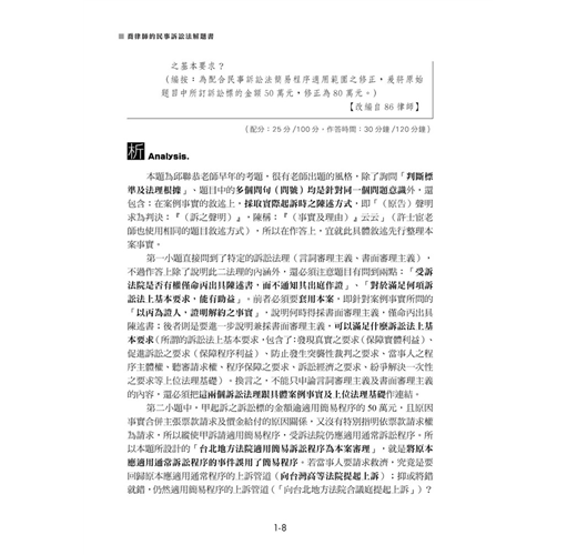 在每個具體的試題中,我們會先就該題目為基本分析。一方面以加強觀念的角度說明該題所涉基礎觀念、學說見解及實務動向,另一方面也會以實際作答審題的角度,分析題目所給的各個線索、引導各位瞭解題目所欲詢問的爭點何在、說明答題上各種可能的選項及版面的分配,有時候也猜測一下出題者的傾向。等於是一面為各位敘明理論,一面也說明審題的方式及技巧