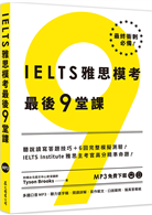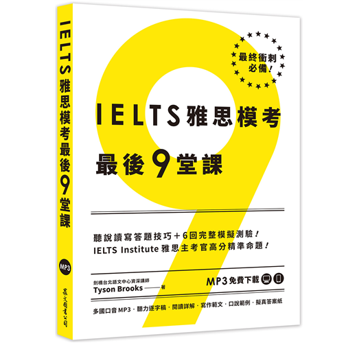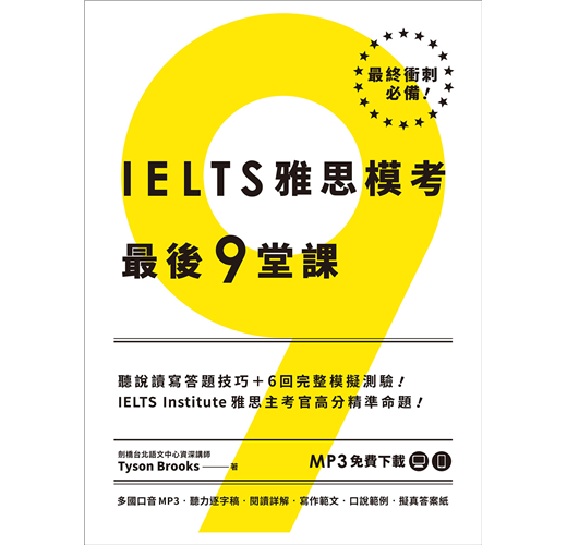 作者Tyson老師以15年雅思教學經驗,濃縮實體「考前模考解析班」的課堂精華,內容包括聽力、閱讀、寫作、口說答題技巧,以及6回模擬測驗,實戰演練。Tyson老師特別增加「答題前」、「答題中」的重點提醒,以破解不同題型,指引考生以最有效率的步驟作答。上場前最後衝刺,就在這關鍵9堂課逼出潛力!