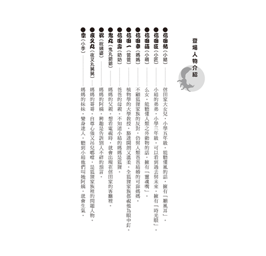 不只如此,狐狸親戚也紛紛來搗蛋!狐狸爺爺送給人類奶奶可以下咒的稻草人;祝姨婆突然在奶奶面前施法現身;狐狸阿姨送的封印戒指害小結失去順風耳能力......眾多危機與災難之下,信田一家該如何化解呢?
