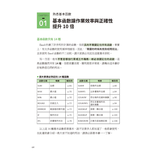 本書教你如何使用Excel讓工作更有效率,製作正確無誤的資料表/表格,並且方便日後維護、調整。這些操作方法完全不用背誦,只要迅速翻看,會讓你了解到「原來還可以這樣思考」、「原來還有這種操作方法」。等到要實際操作Excel時,就能直覺想起書中介紹的技巧與知識。翻開本書就能找到需要的答案,完全不需要背誦內容。