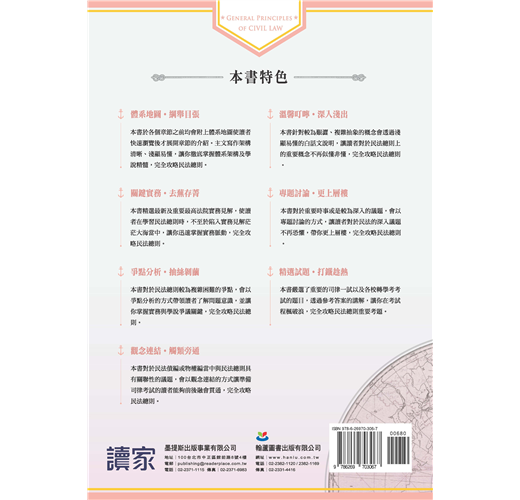 本書針對較為艱澀、複雜抽象的概念會透過淺顯易懂的白話文說明,讓讀者對於民法總則上的重要概念不再似懂非懂,完全攻略民法總則。