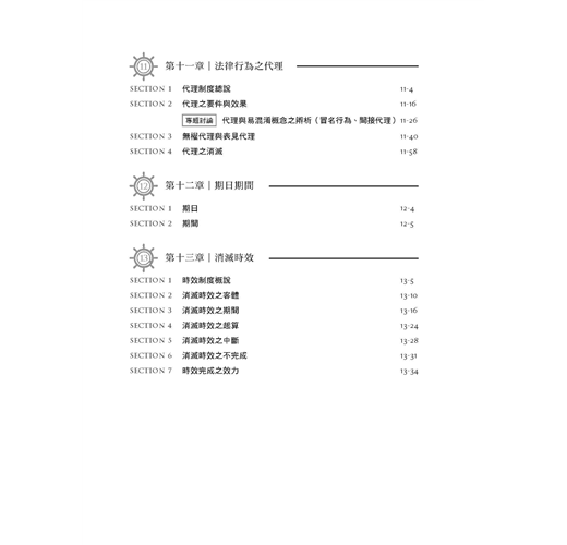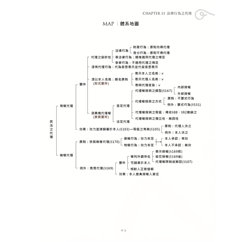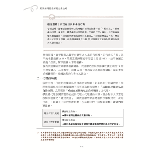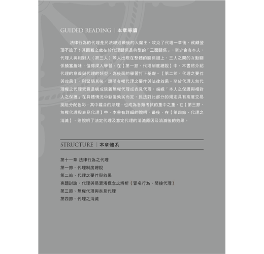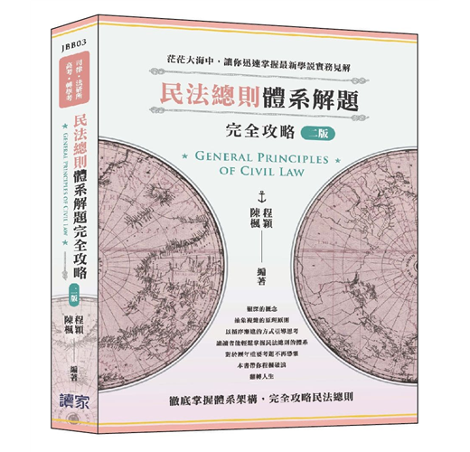 本書於各個章節之前均會附上體系地圖使讀者快速瀏覽後才展開章節的介紹。主文寫作架構清晰、淺顯易懂,讓你徹底掌握體系架構及學說精髓,完全攻略民法總則。