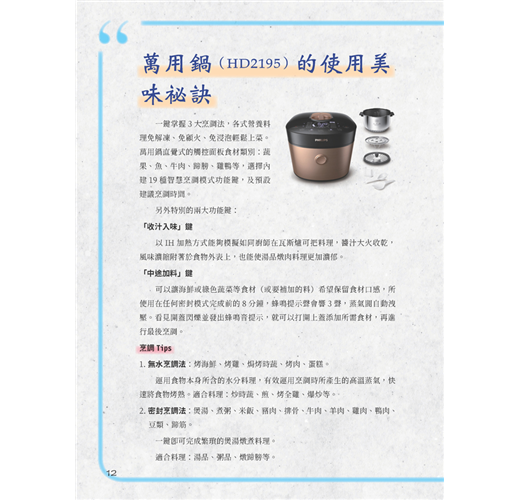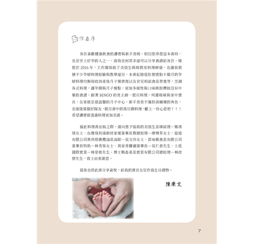 我只能說有了這本書問世,接下來的孕媽媽們真的很幸福,本書有很多老師為了夫人設計的愛心食譜,加上飛利浦萬用鍋與廚神料理機兩位廚房幫手,養胎、坐月子、哺乳期的營養都交給他們,把省下來的時間留給自己好好休息,至少可以好好喝杯媽媽茶。(台灣保樂力加 企業溝通經理/趙珮晴(Lilian Chao)女士)