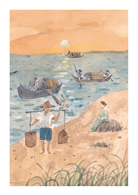 南崁溪經數十里在南崁港出海,有人下船,有人遙望遠方等候船進港、有人吆喝指揮工人搬貨裝卸、小鋪商人、大商號掌櫃夥計在碼頭邊等清點交貨,年紀大點的老手一派輕鬆在鄰近茶攤邊喝茶邊聊天;年輕小伙子耐不住性子,頻頻張望,一輪橘紅大球緩緩沉下水平面,最後一艘船進了港,漢子們又開始忙碌起來。